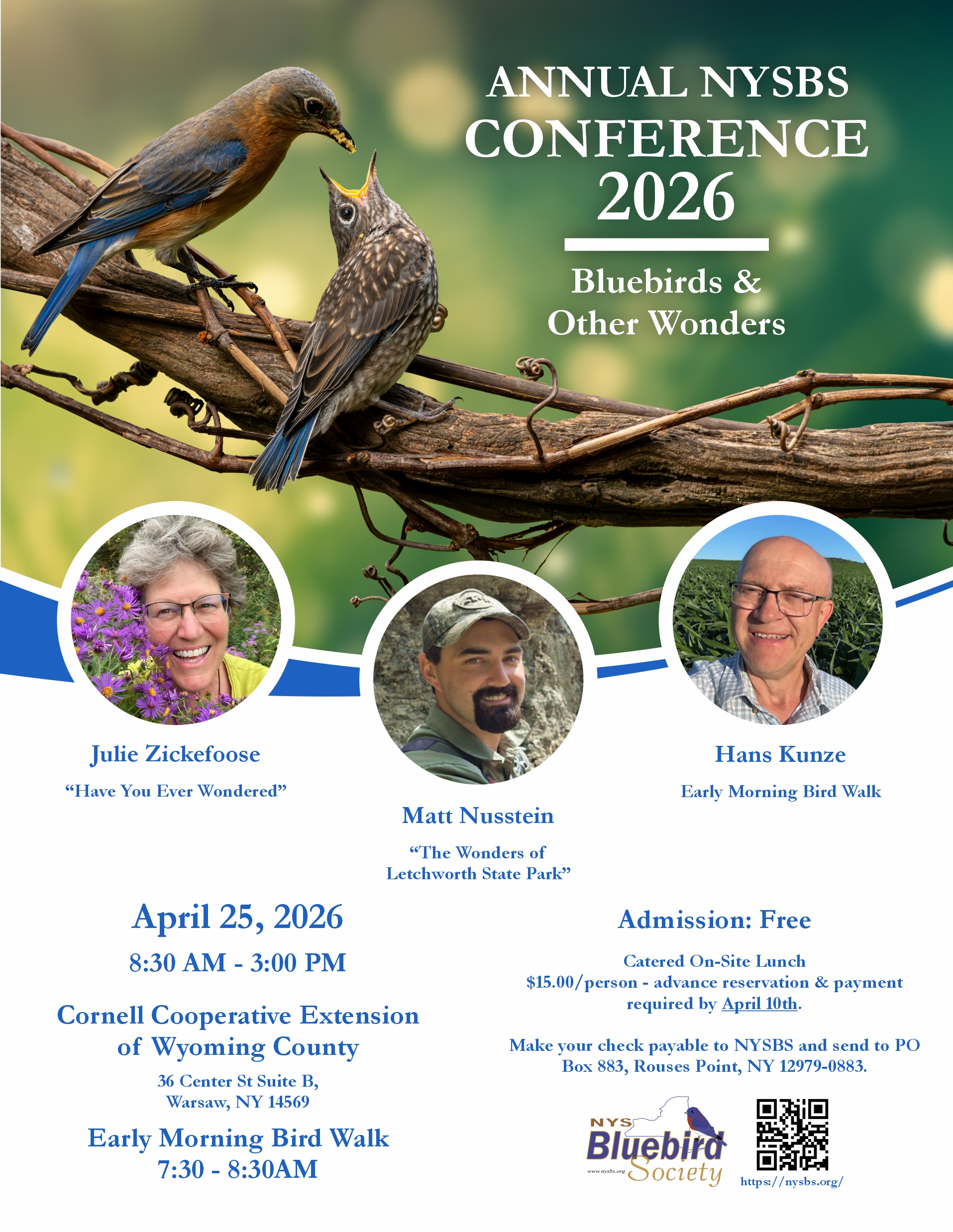 As with past conferences, we will be offering items for sale, so plan to bring a little extra spending money for the basket raffles, and assorted NYSBS items for sale. Attendees may also pick up quality handmade nest boxes built by our very own Steven Douglas. These nest boxes must be preordered and paid for in advance at the reduced price of $25.00.