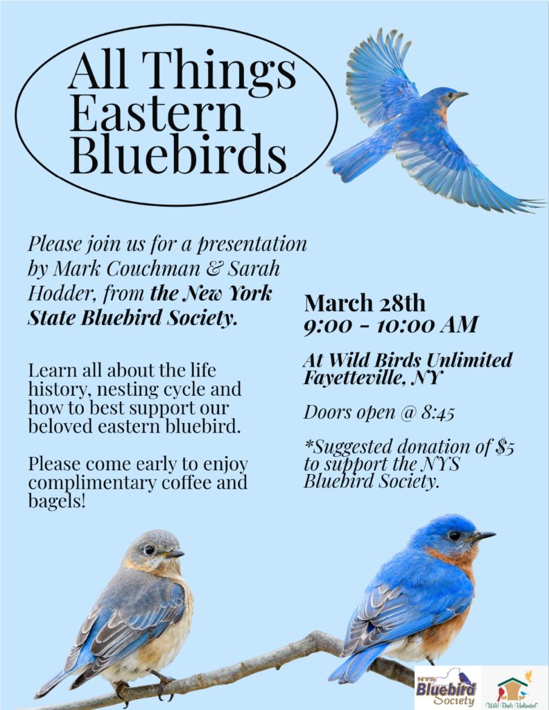 Learn all about the life, history, nesting cycle, and the many challenges the Eastern Bluebird faces. Also learn how to best support our beloved Eastern Bluebird. Please come early to enjoy complimentary coffee and bagels. Please join us as Mark Couchman (Bluebird Ambassador) & Sarah Hodder (President of NYSBS) present on Saturday, March 28th from 9-10 at Wild Birds Unlimited in Fayetteville. Doors open at 8:45. There is a suggested donation of $5 to support the NYSBS(New York State Bluebird Society). Looking forward to seeing you there.